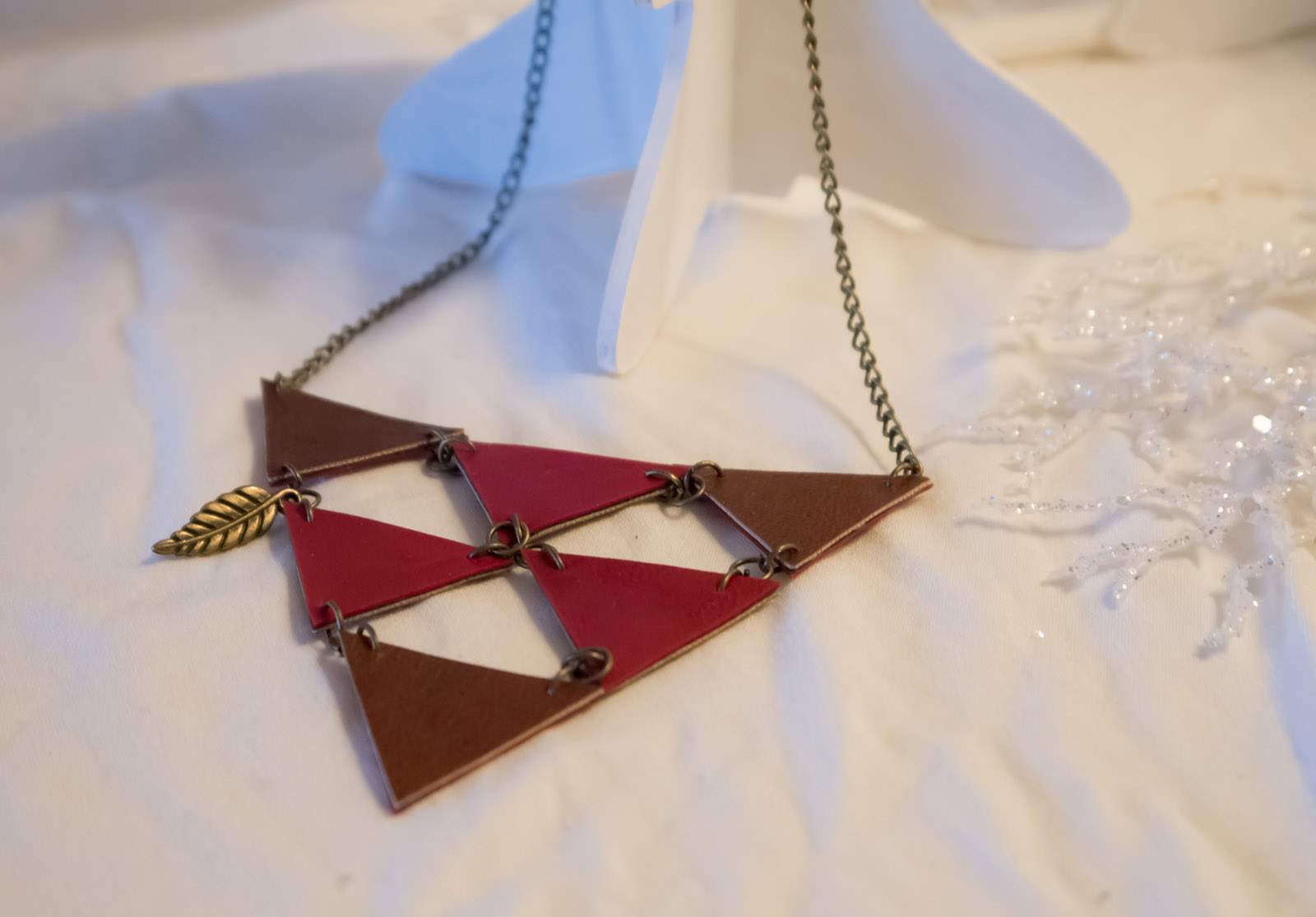 -Un collier triangle réversible avec du faux cuir et une petite feuille pour un esprit bohème.
