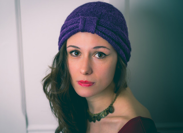 Il s'agit du modèle de bonnet turban Phildar tricoté dans une laine alpaga Drop en aiguilles 3, comme d'habitude en suivant le patron je me suis retrouvé avec un bonnet trop court, je l'ai donc rallongé de environ 5cm et je le trouve encore un chouia petit, j'aime avoir les oreilles bien couvertes! J'avais peur du côté très rétro du bonnet mais ce violet est assez moderne et se marie bien avec pas mal de couleurs notamment le bordeaux.