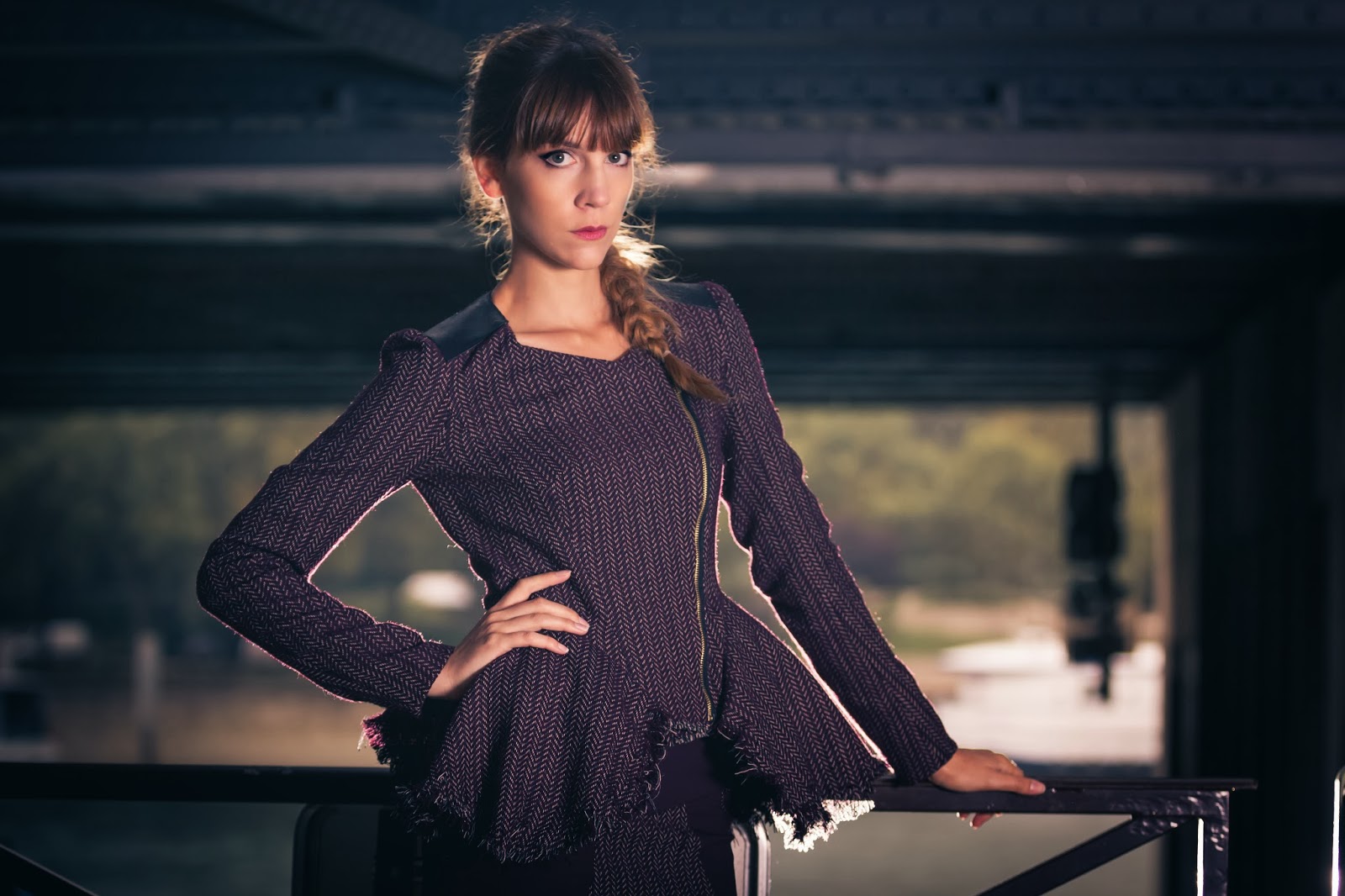J'ai donc travaillé une veste inspiration perfecto avec le zip côté, des applications de cuir épaules et des pans travaillés dans le biais sur le côté qui soulignent la taille (fine) de Mimii!