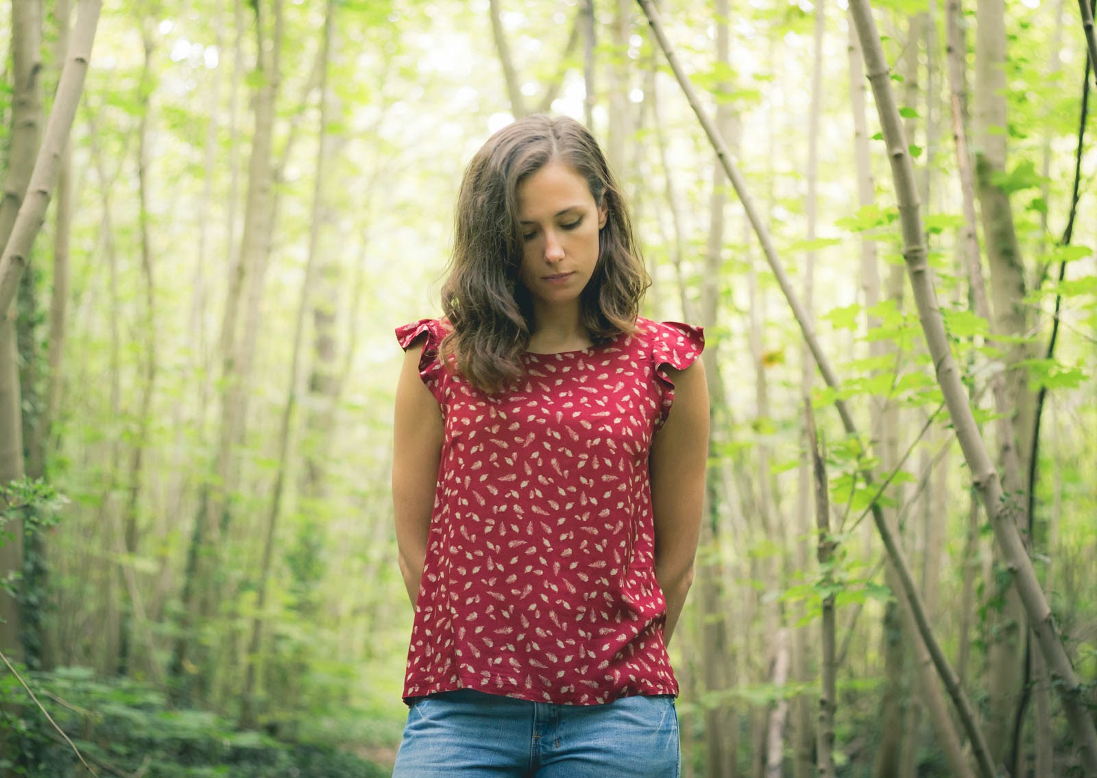 Il s'agit d'un patron improvisé, une base de top simple légèrement loose avec deux pinces reprise d'un vieux Burda et des petites manches volantées qui m'ont causées problèmes!