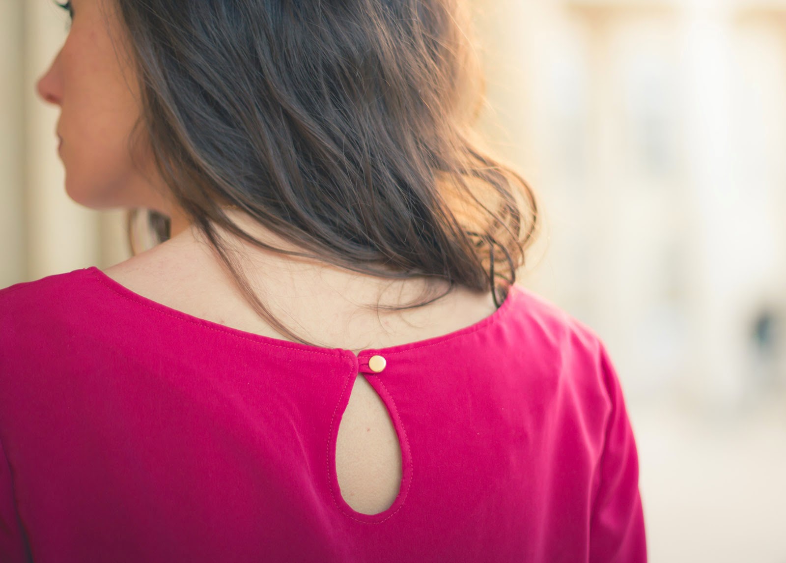 J'ai déplacé la goutte dans le dos pour un rendu chic et plus sobre, la couleur et la basque faisant déjà leur petit effet. Je tente d'épuiser mon stock tissu avec un vestige coloré de mes quelques mois passé chez Mondial Tissu.