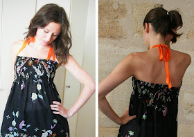C'est la première fois que je la porte et elle est très confortable, romantique et chic à la fois. Le tissu est fluide et tombe joliment avec la taille empire, taille resserrée par un ruban et finalement le décolleté est en coeur, elle est bien sur entièrement doublée et le patron est une oeuvre de mes bidouillages!!! Alors alors, vos impressions?
